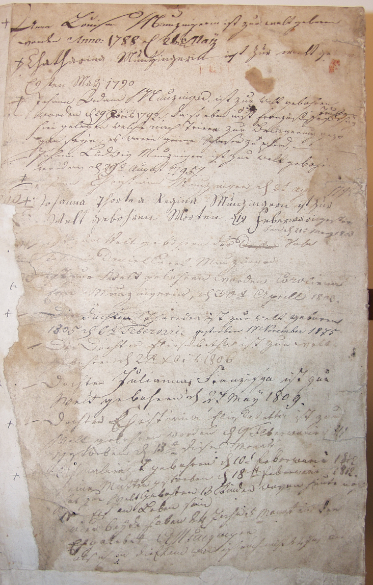 Adam Munzinger (1765 - 1839), Postmaster and Burgermeister of Bruchmühlbach was the original owner of this ~1728 Bible, which is once again in the possession of his descendants.