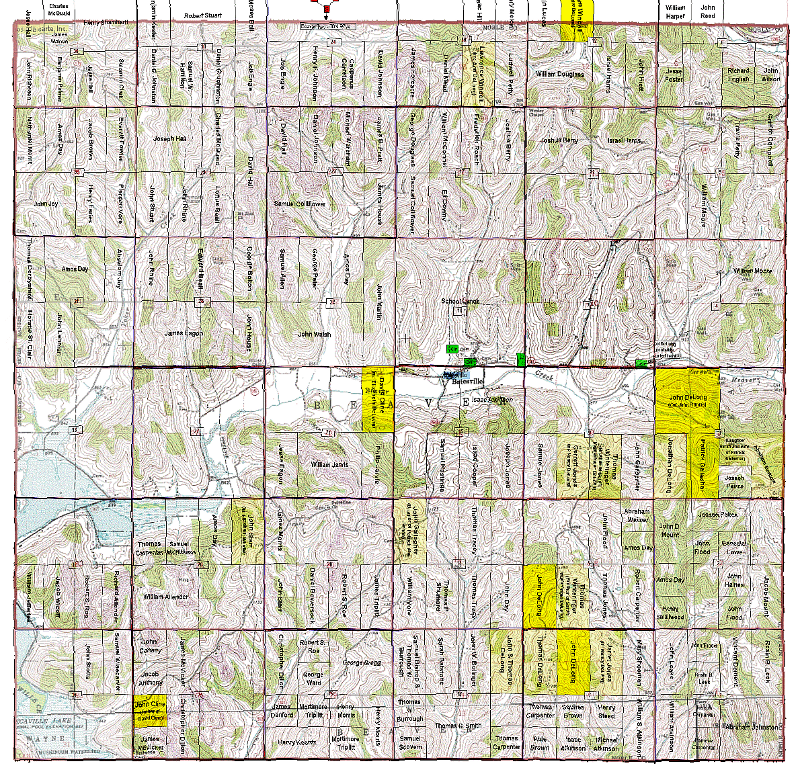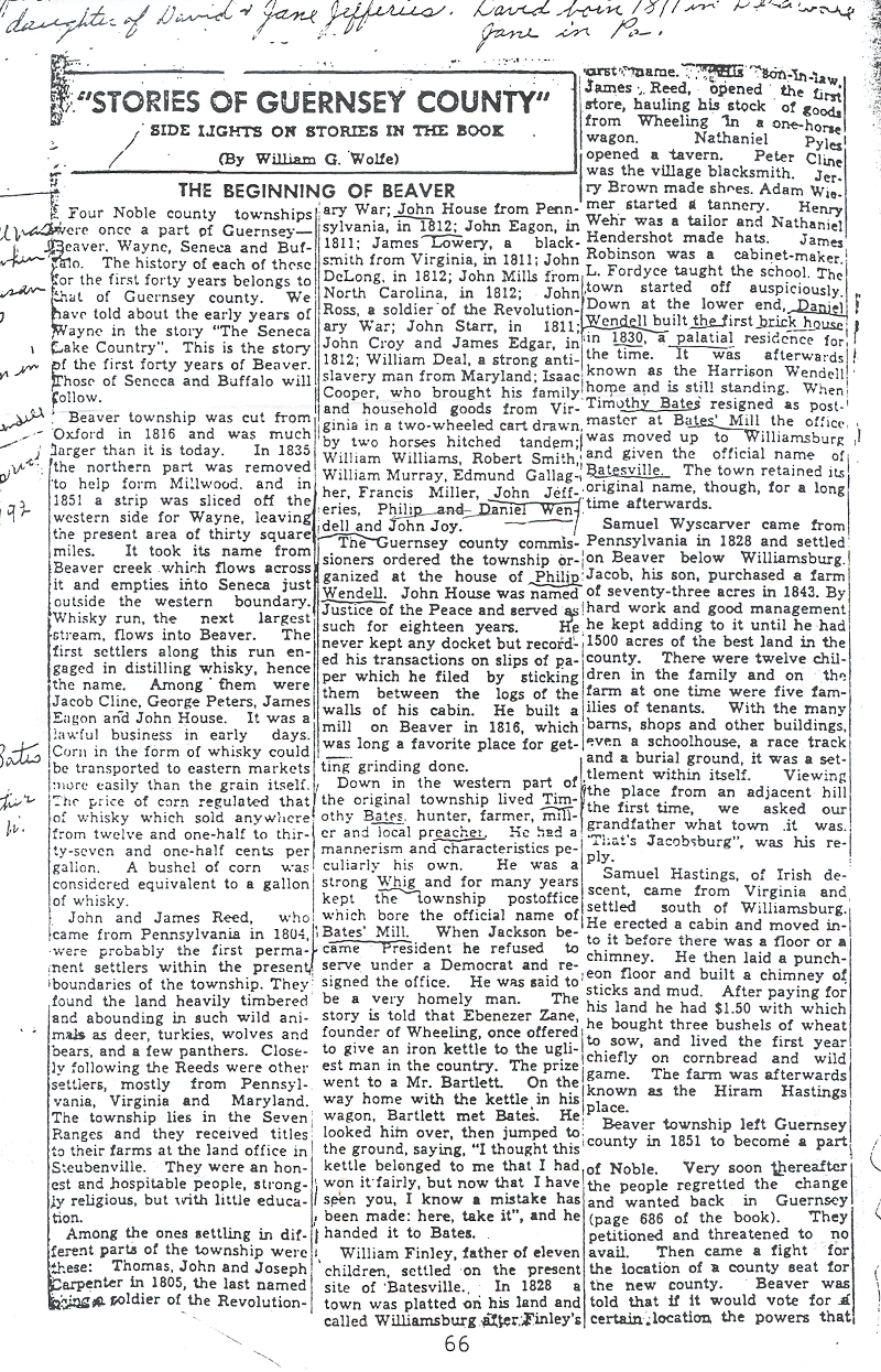 Beaver Township, Guernsey County, was where Philip Wendel and his wife Barbara Swartz chose to settle in 1801, after an arduous trek across the Allegheny Mountains from Toms Brook, Virginia with their first six children. They received title to their land on December 22, 1801. In the village of Willamsburg, now Batesville, they bought a plot near Beaver Run and engaged in the agriculture of the day, probably including distilling of corn liquor. In the 1851 creation of Noble County, Ohio, Beaver, Wayne, Buffalo, and Seneca Townships of Guernsey were carved off to form the northern tier of the new Noble County, Ohio.