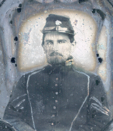 Tintype, apparently taken during his service. The stripes on the sleeves suggest that this was taken when he was a sergeant, before his 12 FEB 1863 commission to 2nd Lieutenant.