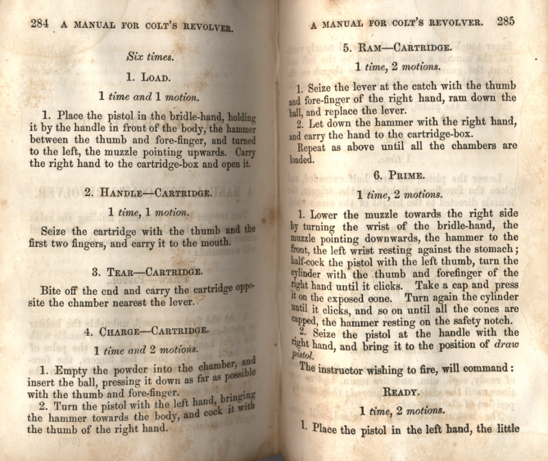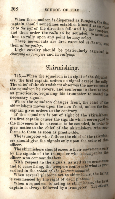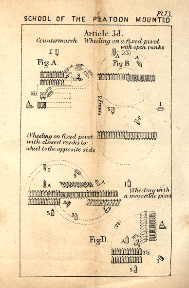 The front cover and publicaton page in the front of this little manual are unfortunately lost -- but later research reveals it is "Cavalry Tactics, or Regulations for THE INSTRUCTION, FORMATIONS, AND MOVEMENTS of THE CAVALRY of the ARMY AND VOLUNTEERS OF THE UNITED STATES", by Colonel Philip St. George Gooke, 2d U. S. Cavalry, VOL II., Washington, Government Printing Office, 1861.