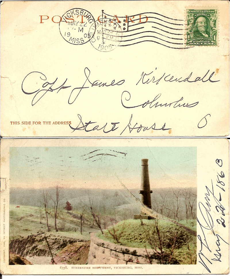Capt. James W. Kirkendall was very active in Civil War veterans memorials and commemorative activities. Among his mementos was this postcard commemorating the surrender of Vicksburg. Note that it was signed by W. L. Curry, compiler of the History of the First Regiment, Ohio Volunteer Cavalry (see title page below).
