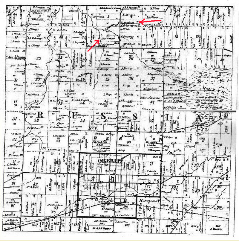 1859 Plot Map of Russia Twp., showing locations of Christian Adam Munsinger and John Munsinger farms, north of the village of Oberlin.