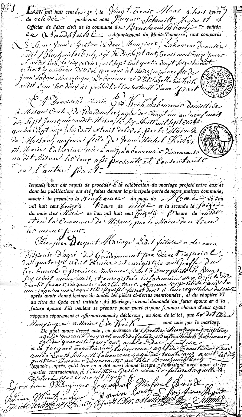 Marriage record of Christian Adam Munzinger and Maria Eva Krick, written in Old French because the area was within Napoleon's empire. Names at the bottom show different spellings of "Krick" and "Munzinger".
