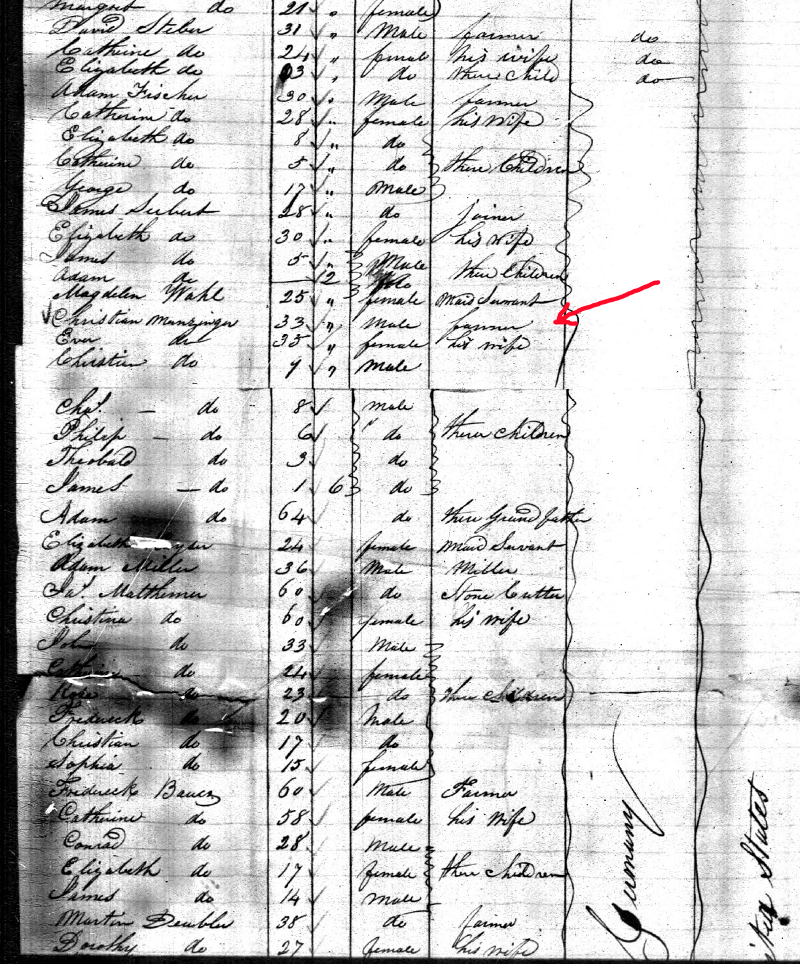 Passenger list from the ship "Helen", arriving New York, 1828, showing Christian Adam Munzinger with his wife Eva and children, and his father Adam.