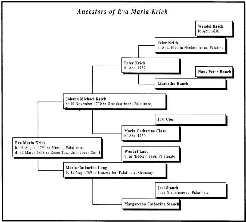 Ancestors of Maria Eva Krick, wife of Christian Adam Munzinger. As a descendant of Wendel Krick, she was a second cousin, once removed, to his mother.
