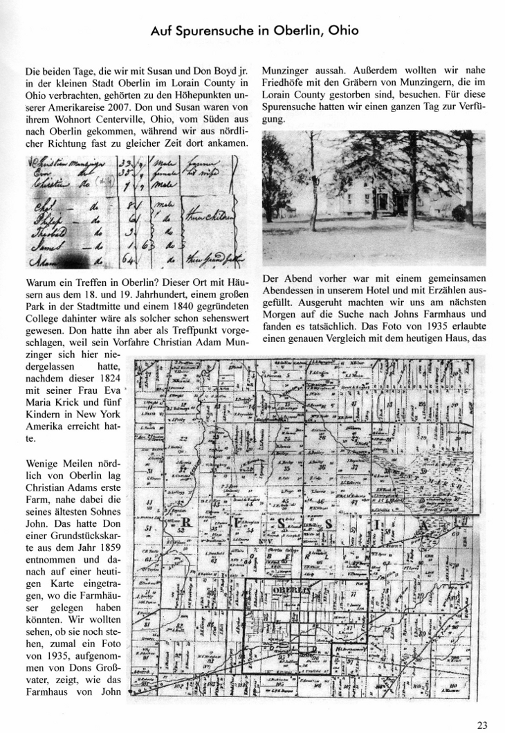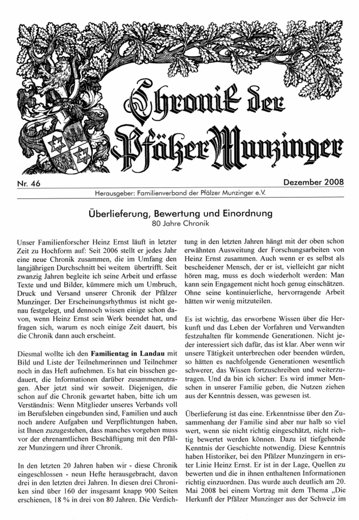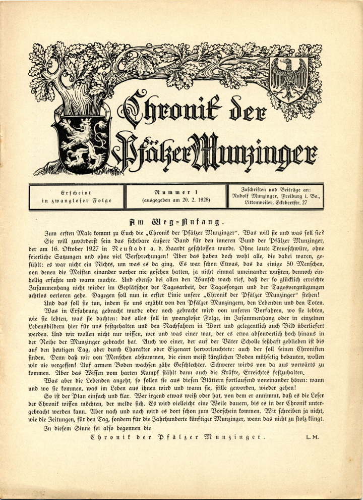 Since 1928, the Munzinger Family Association has published its "Chronik" or chronicle of noteworthy family events, members, and research. Family Day (Familientag), the reunion, was held every other year except the war years, and the Chronik was published biennially in the years between Family Days. I'm including enough copies of Chronik materials to give German readers a taste of the kinds of history, events, and research that the Munzinger family researchers reported.