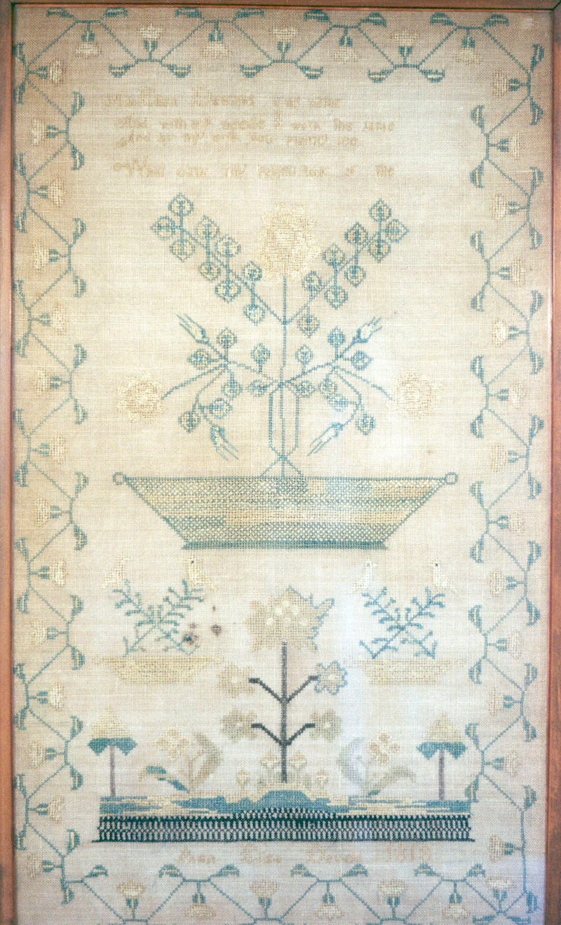 In the "Pennsylvania Dutch" German-American tradition of the time, Ann Eliza prepared a "sampler" -- a demonstration of her proficiency with needlepoint, on a piece of fine linen. The date is 1818 -- the passage of almost 200 years has not been kind to the colors in the thread.