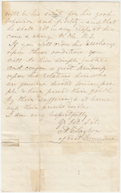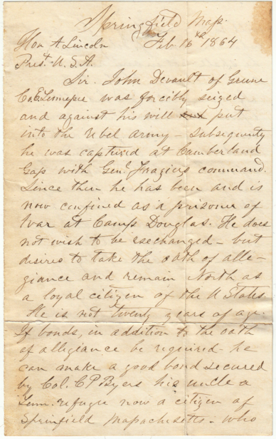 This letter to President Abraham Lincoln reflects the desperate circumstances of John Augustus DeVault's forcible conscription into the Confederate Army, and subsequent capture and imprisonment at Camp Douglas (Chicago) . It says that he would prefer to take the oath of allegiance and remain in the northern states for the duration of the war, rather than be exchanged back to the Confederate Army.