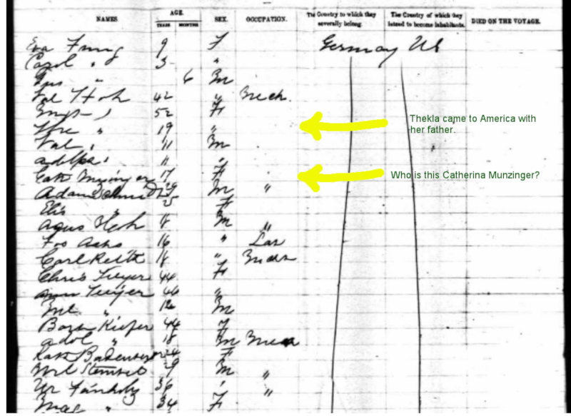 Valentin Höh and his wife Margaretha Munzinger immigrated with their children on 1 June, 1864 as shown on this page of the passenger list for the ship SS Teutonia. But, who was the Catherina Munzinger, age 17, who immigrated with them?