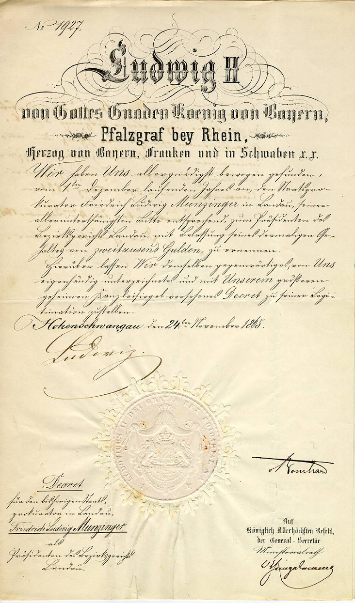 Appointment of Friederich L. Munzinger to be President of the Landau District Court, 1865, signed by King Ludwig II of Bavaria.