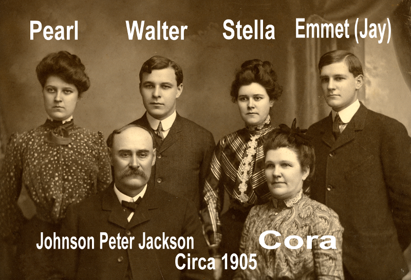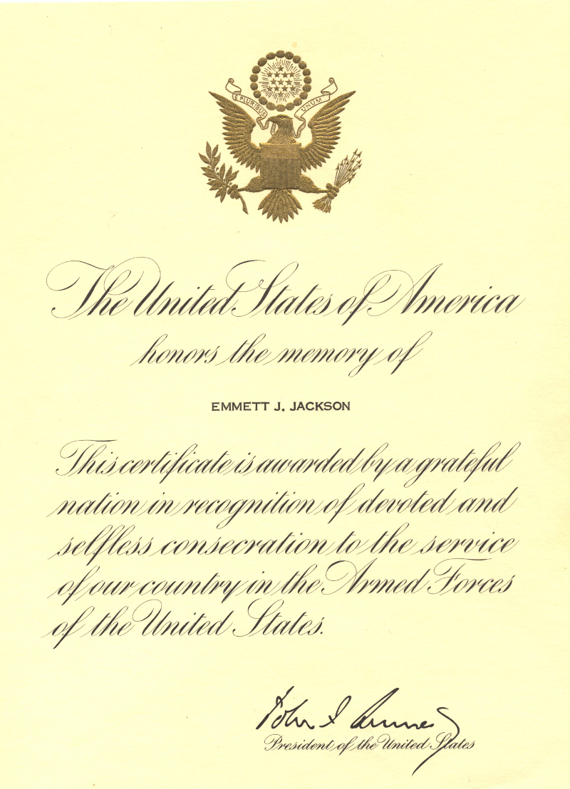 William Jackson, born 1827 in Boone County, Kentucky, is found in the 1850 census living in Rushcreek Township, Logan County, Ohio with his new wife Elizabeth McLaughlin. They were in Liberty Township, Hardin County, Ohio in the 1860 census, with the first four of their eight children. In the 1880 census he indicated both parents were also born in Kentucky. We do not know which Jackson family of Kentucky William came from -- possibly the "M. E. Jackson" of the 1840 census of Boone County was his father. His son Johnson Peter Jackson, born in 1854, became a railroad conductor and lived at Ft. Wayne, Indiana with his wife Cora Catherine Marshall, where they raised a family of four children, two sons and two daughters. Son Emmett J. Jackson, born 1885, became a lawyer and judge, and served in both World Wars, resulting in the presidential certificate below, issued from the Kennedy White House. Judge Jackson sat on the bench at Lima, Ohio in the early 1920s, and then relocated and took a judgeship at Dayton, with service in the U.S. Army Judge Advocate office in Texas during WW II.