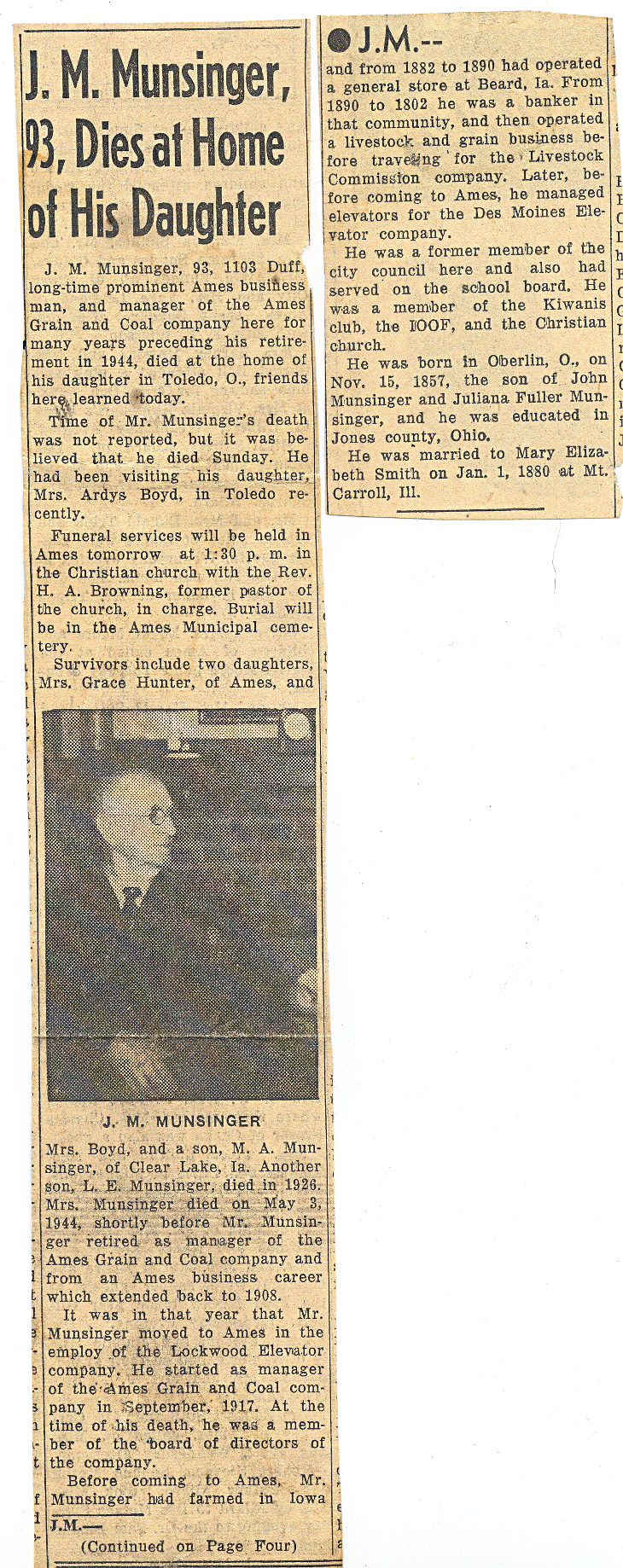 Obituary. Note several errors -- Jones County is in Iowa, his first store was in Bayard, Iowa, his mother was Julina Fuller, etc.