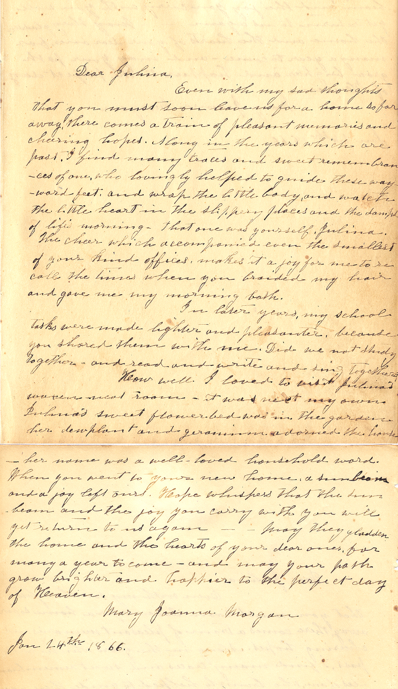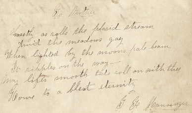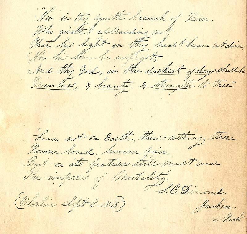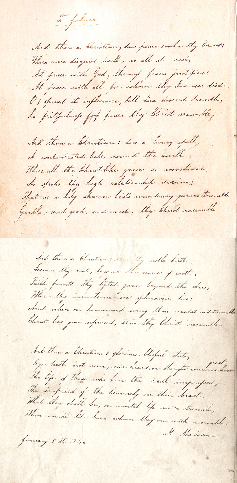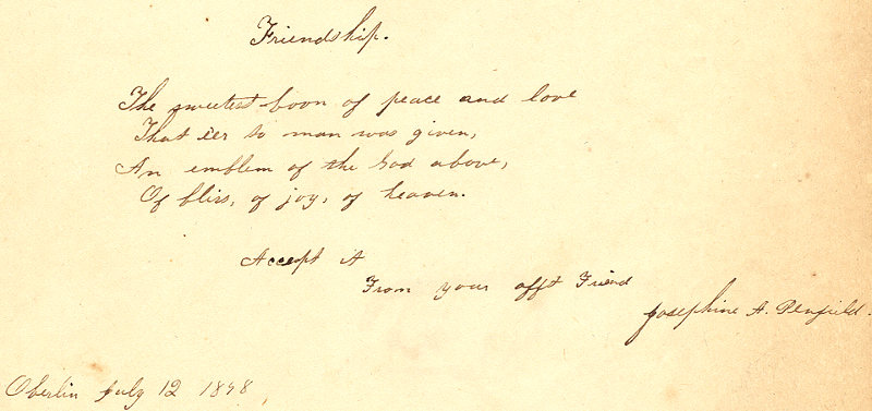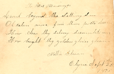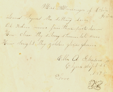 Julina was sent by her parents from Ashtabula to live in the household of Rev. Professor John Morgan, of Oberlin College, probably after 1840 when she turned 18. She was a household servant, receiving room and board, and apparently affection and excellent advice, in exchange for helping Mrs. Morgan with the children and household. From the Oberlin College archives, we learned that she attended about two years of "preparatory" education (rougly equivalent to a modern high school curriculum). Apparently in 1845, since the earliest inscription is dated in August of that year, she acquired a fine leatherbound "Album", originally containing blank pages, including occasional green or pink colored pages, along with some pen and ink prints in the romantic style of the early 19th century. Periodically her friends, including the Morgans, and her children wrote inscriptions in the little book, particularly on special occasions such as her 1866 impending relocation from Oberlin to Iowa. Her album was passed to her son James Monroe Munsinger, then to his daughter Grace, and when Grace died to her younger sister, my grandmother Ardys (Munsinger) Boyd who passed it to my father, and thence to me. I scanned it in its entirety, in 1999.