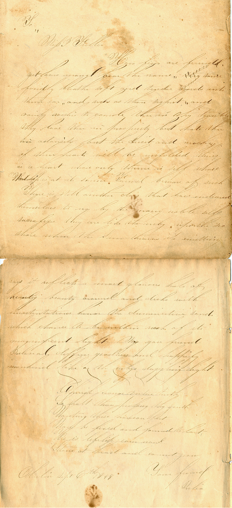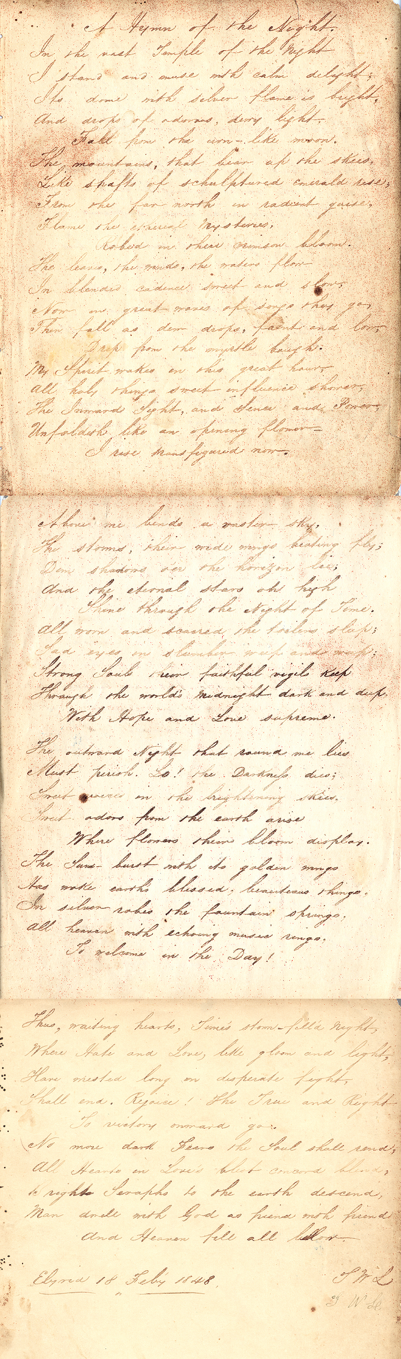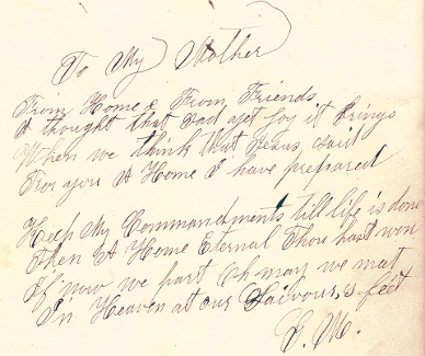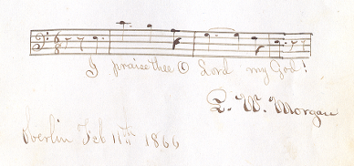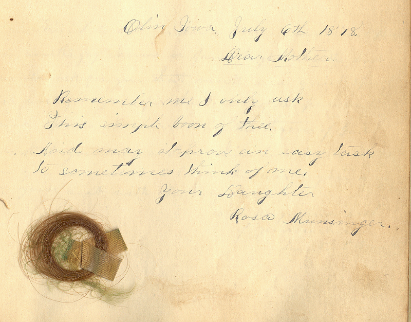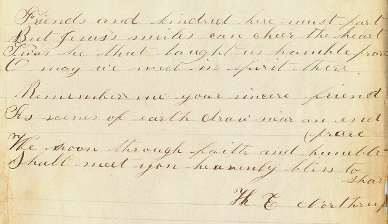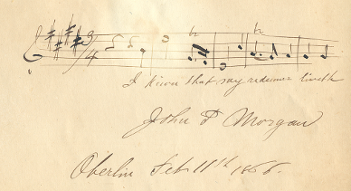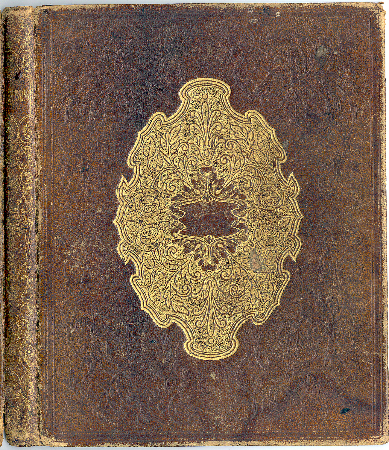 Julina was sent by her parents from Ashtabula to live in the household of Rev. Professor John Morgan, of Oberlin College, probably after 1840 when she turned 18. She was a household servant, receiving room and board, and apparently affection and excellent advice, in exchange for helping Mrs. Morgan with the children and household. From the Oberlin College archives, we learned that she attended about two years of "preparatory" education (rougly equivalent to a modern high school curriculum). Apparently in 1845, since the earliest inscription is dated in August of that year, she acquired a fine leatherbound "Album", originally containing blank pages, including occasional green or pink colored pages, along with some pen and ink prints in the romantic style of the early 19th century. Periodically her friends, including the Morgans, and her children wrote inscriptions in the little book, particularly on special occasions such as her 1866 impending relocation from Oberlin to Iowa. Her album was passed to her son James Monroe Munsinger, then to his daughter Grace, and when Grace died to her younger sister, my grandmother Ardys (Munsinger) Boyd who passed it to my father, and thence to me. I scanned it in its entirety, in 1999.