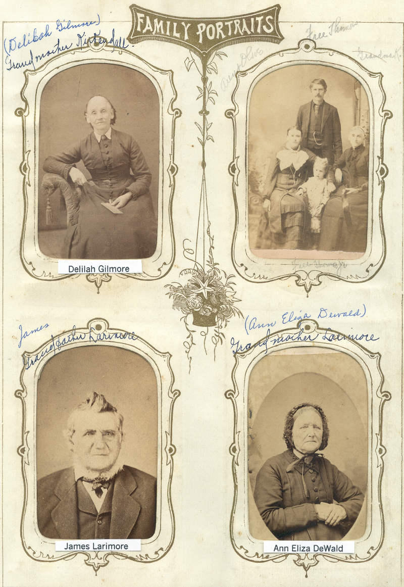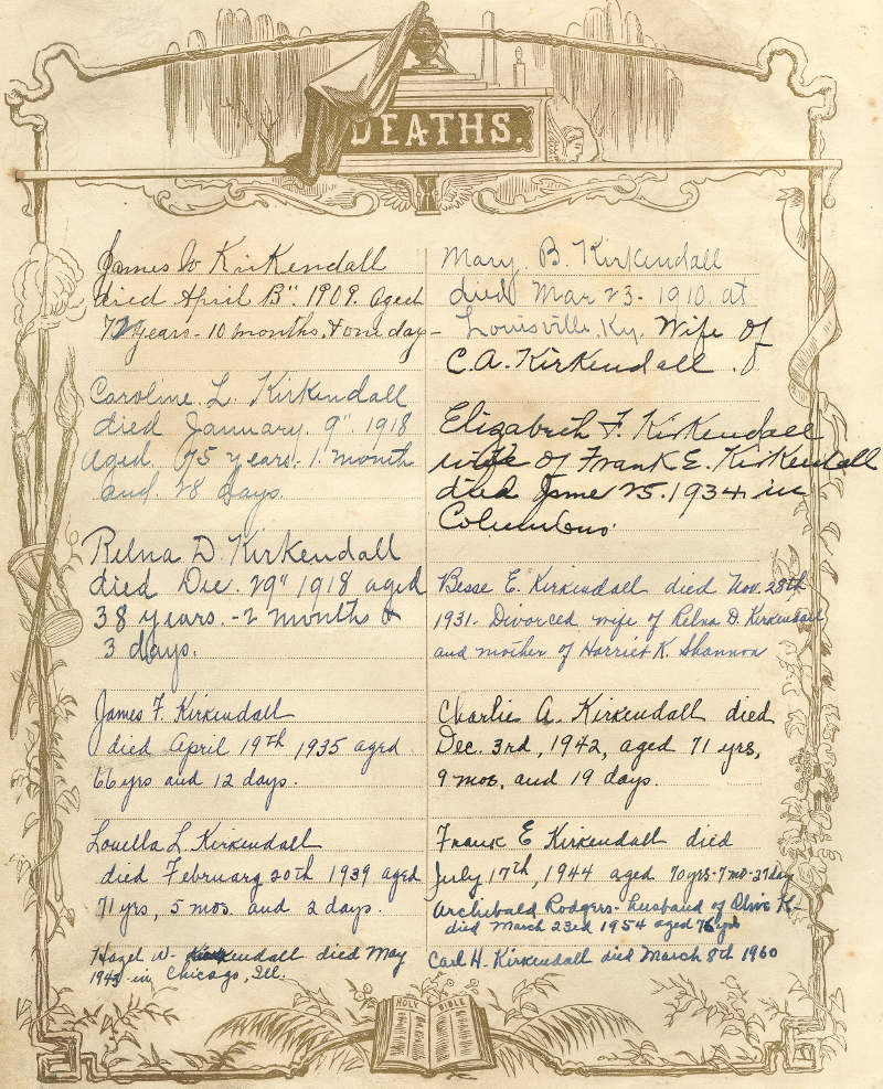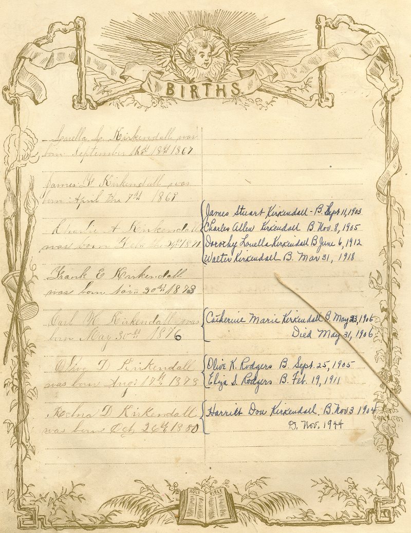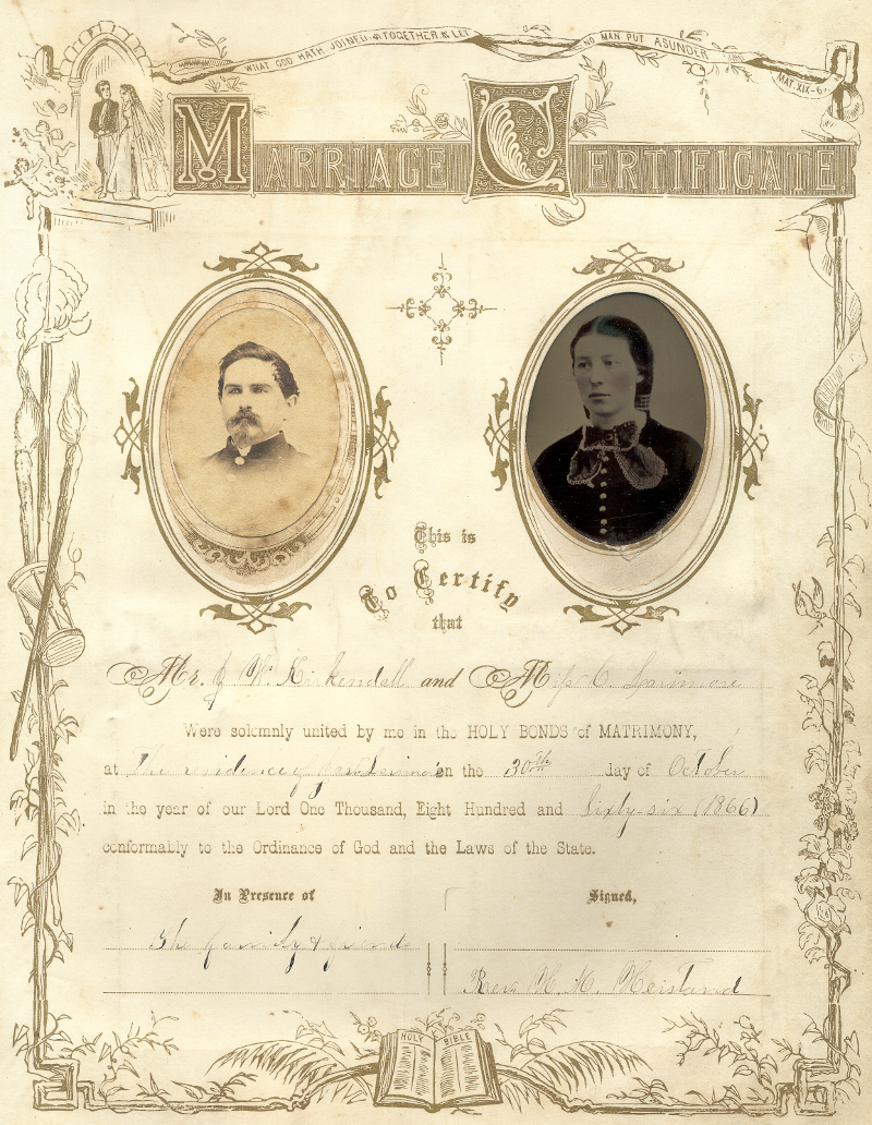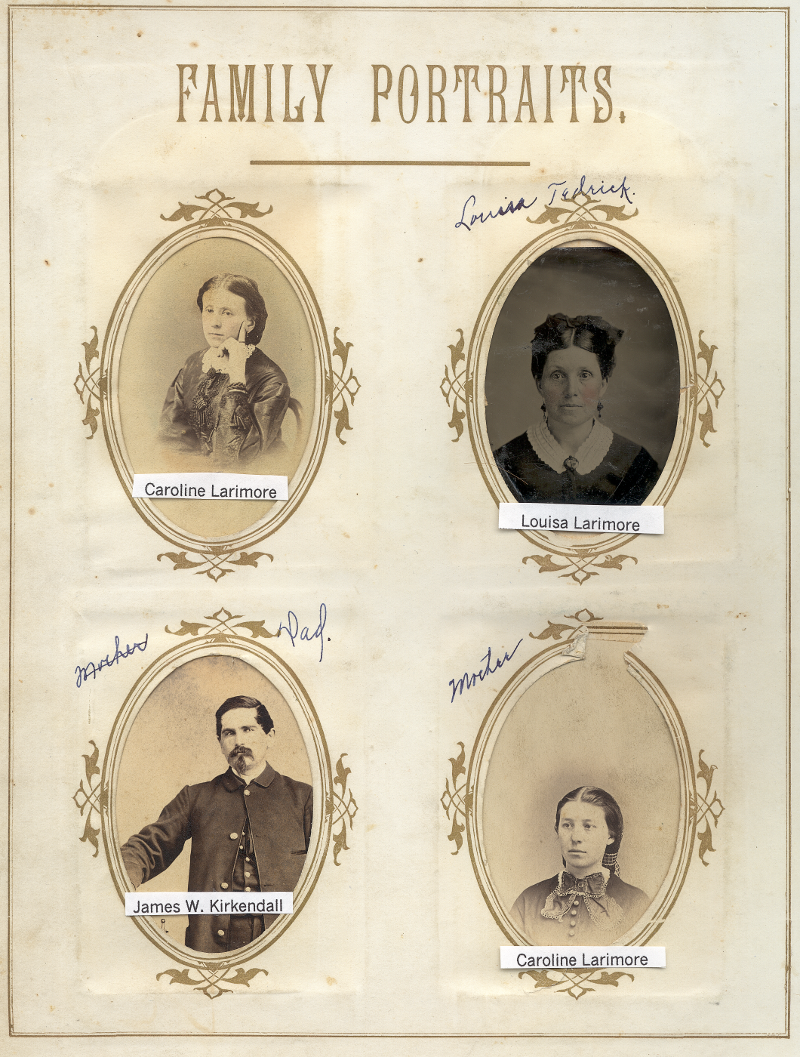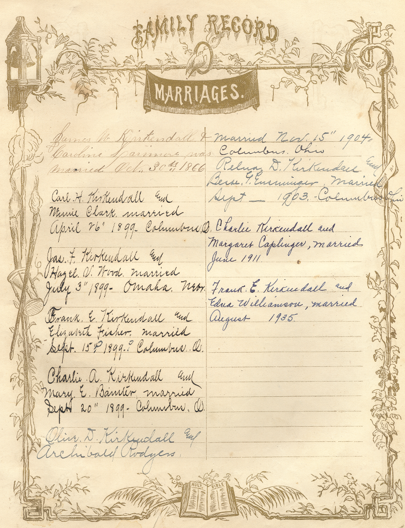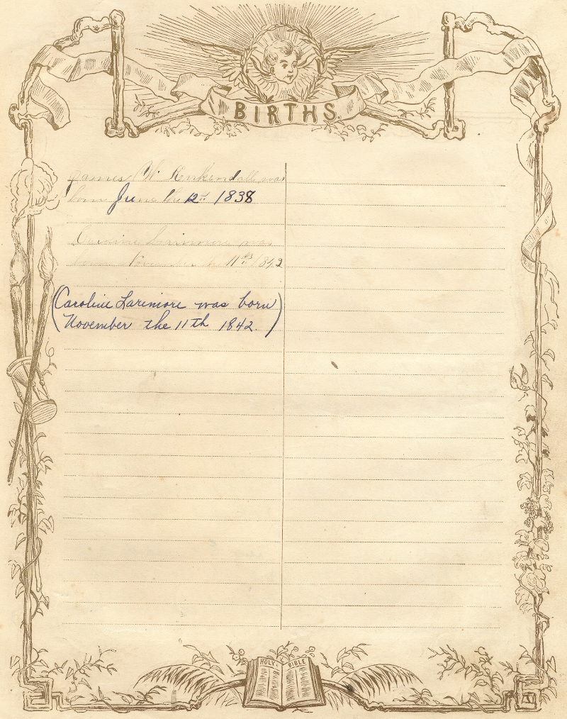 This Bible, containing an elaborate section for recording family events and photographs, was apparently new for the marriage of James W. Kirkendall and Caroline Larimore in 1866 -- this is the first inscription in it.