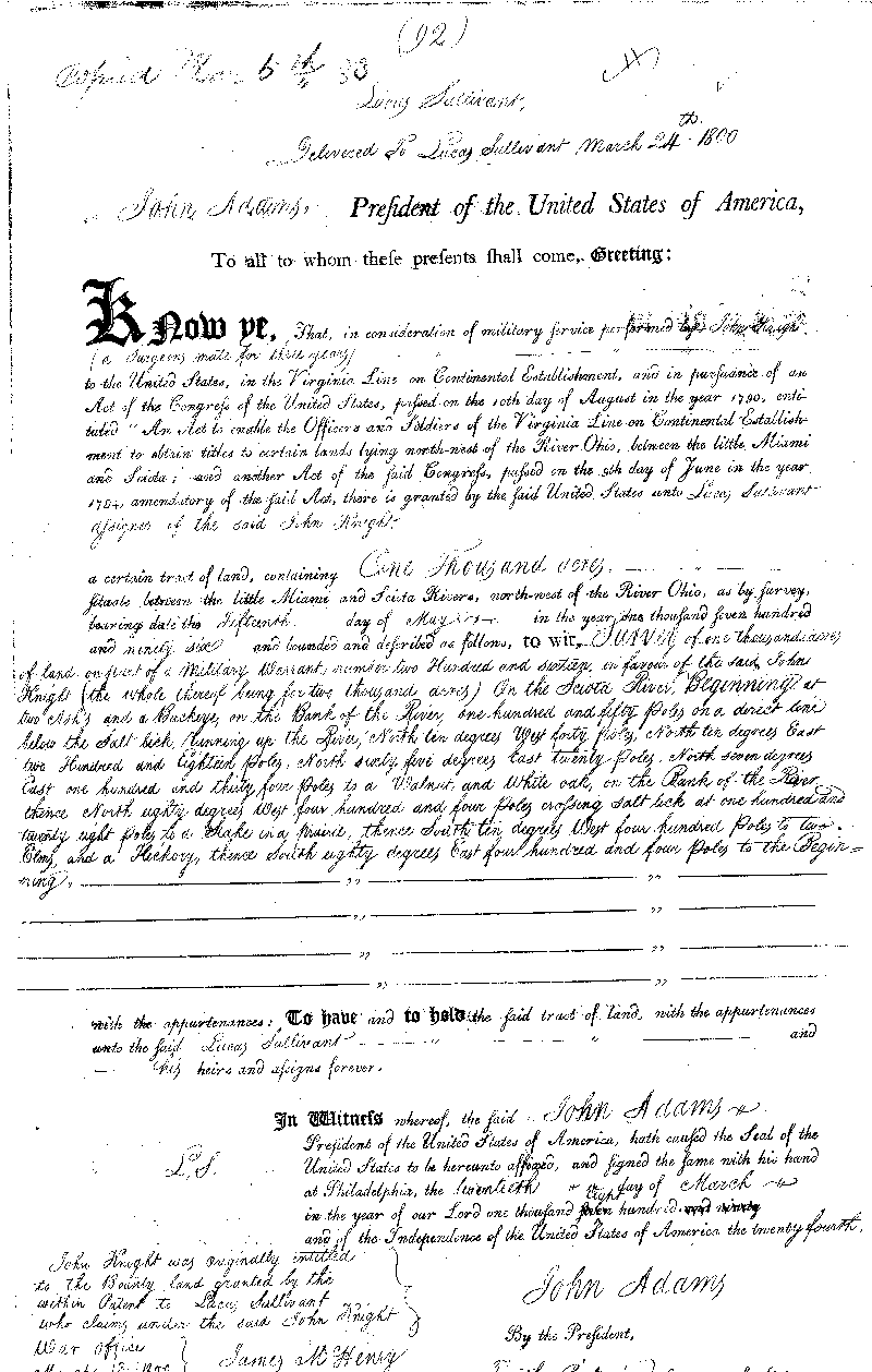 1800 Revolutionary War service land warrant for 1,000 acres in the Military District between the Little Miami and Scioto Rivers -- through purchase of many of these warrants Lucas Sullivant acquired vast lands in central Ohio at the beginning of the 19th century.