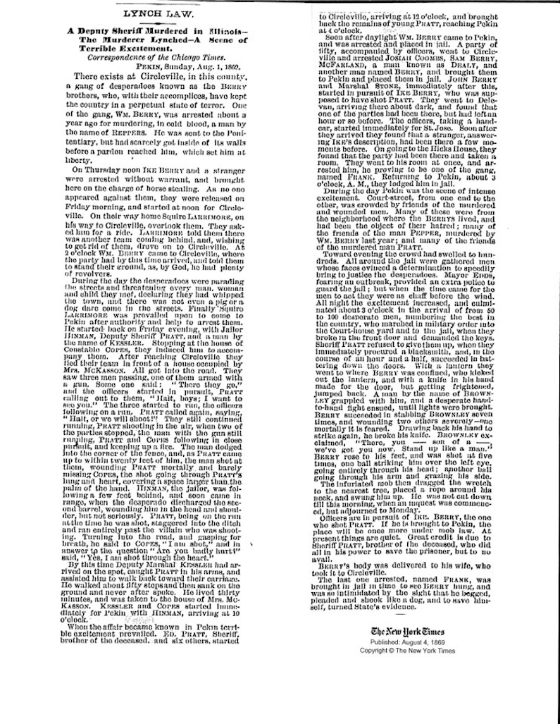 1869 New York Times article about the violence preceding the lynching of William Berry.