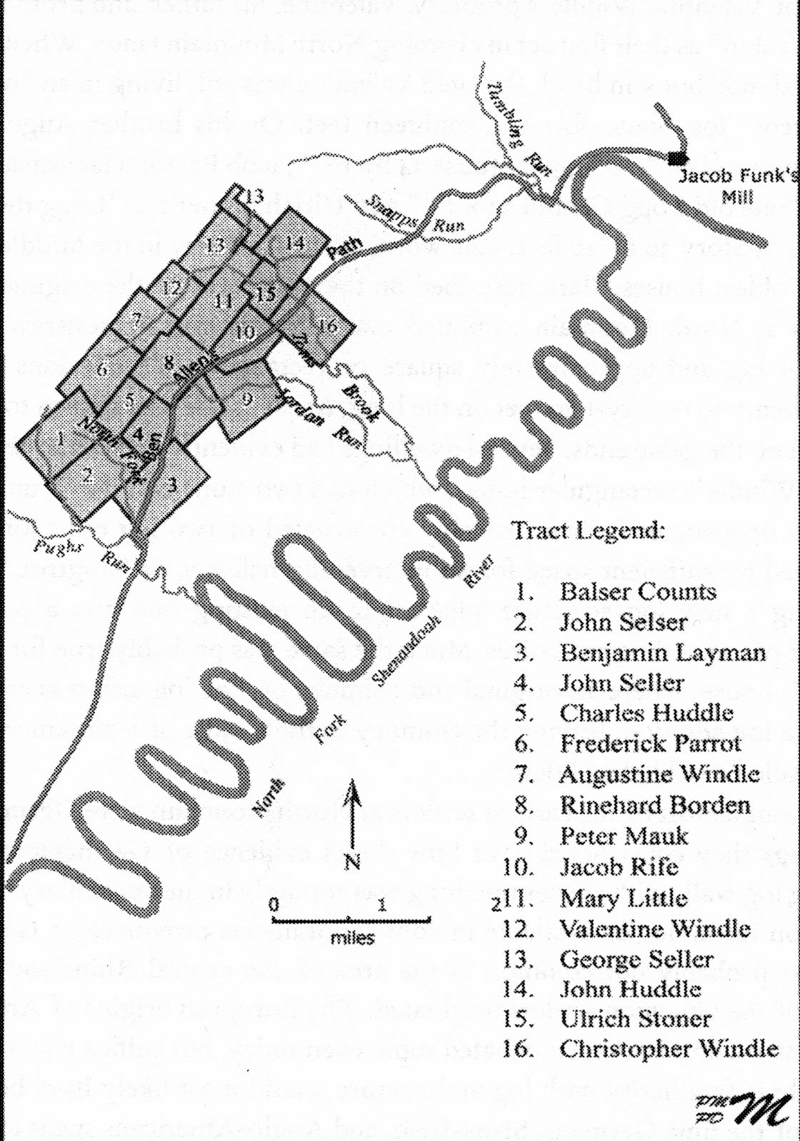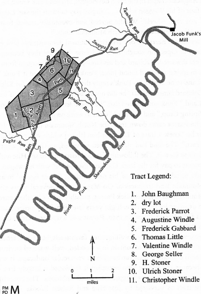 Philip Wendel of Framersheim traveled south on what would later be called the Great Wagon Road from Pennsylvania, and bought land for his three sons from Jost Hite in the late 1730s. Some documentation of these events was found in a lawsuit "Christopher Windle et. al vs. Jost Hite Descendants" in a Chancery Court decision in 1790. The first three graphics below, depicting the early European settlements of the Shenandoah Valley, and the North Mountain Tract properties, are used by permission and are subject to the following copyright notice: