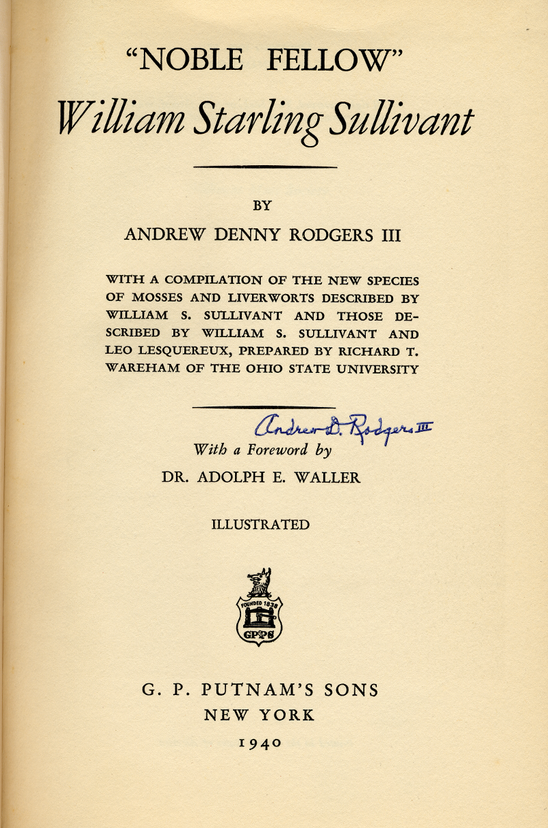 A. D. Rodgers III was a great-grandson of William S. Sullivant, and first cousin of my grandmother, to whom he signed this copy.